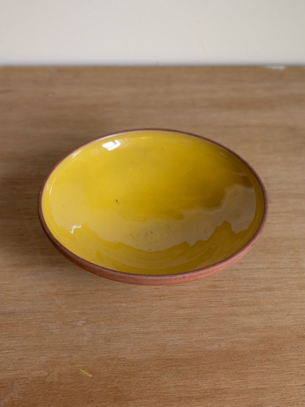 A medium-sized yellow glazed terracotta bowl, the outside is left unglazed