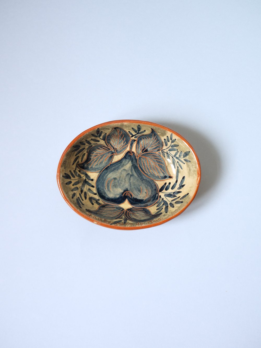 A small blue/off-white painted terracotta bowl, made in Portugal