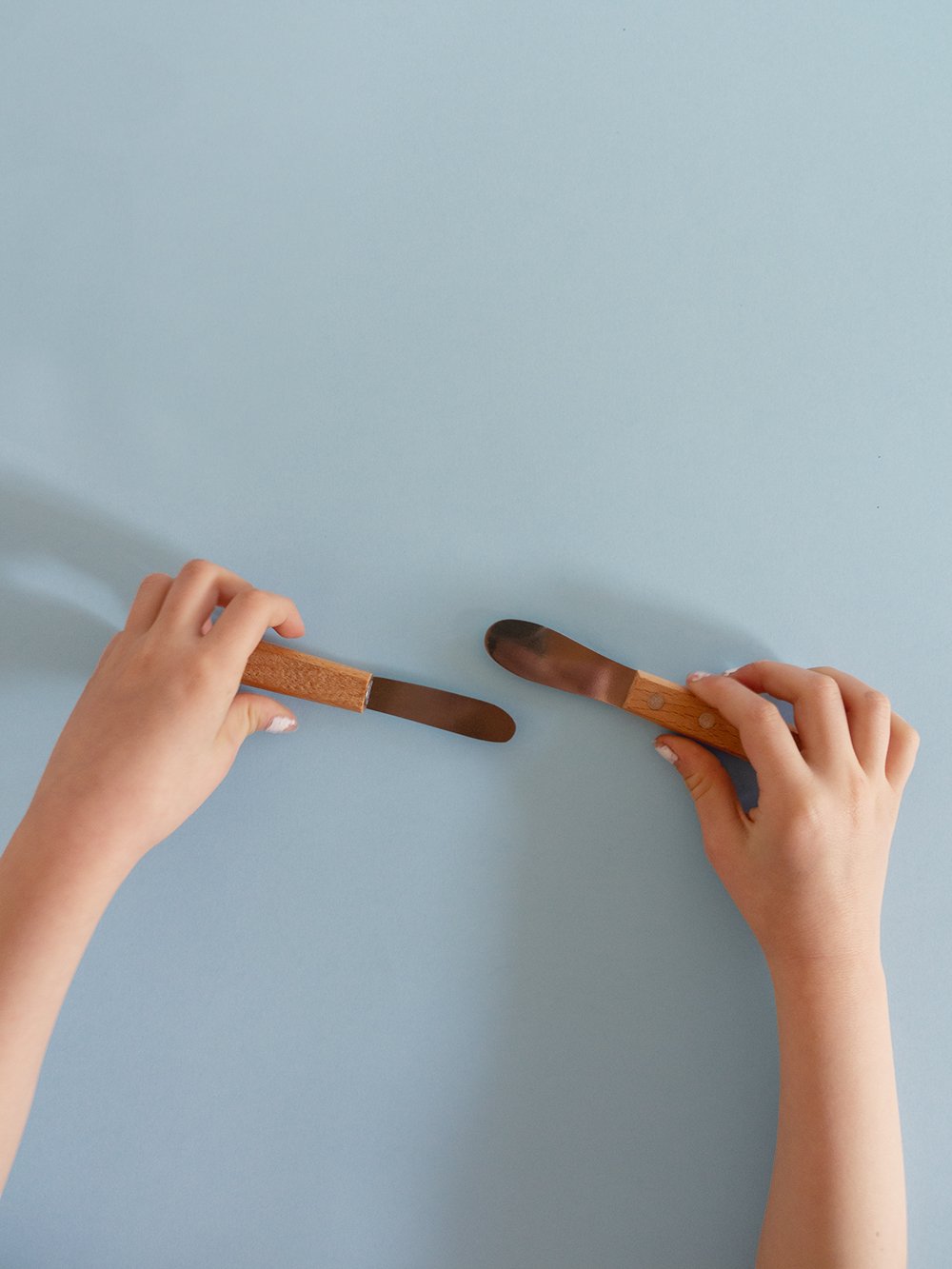 A set of 2 tiny wooden knives, perfectly safe for little hands.