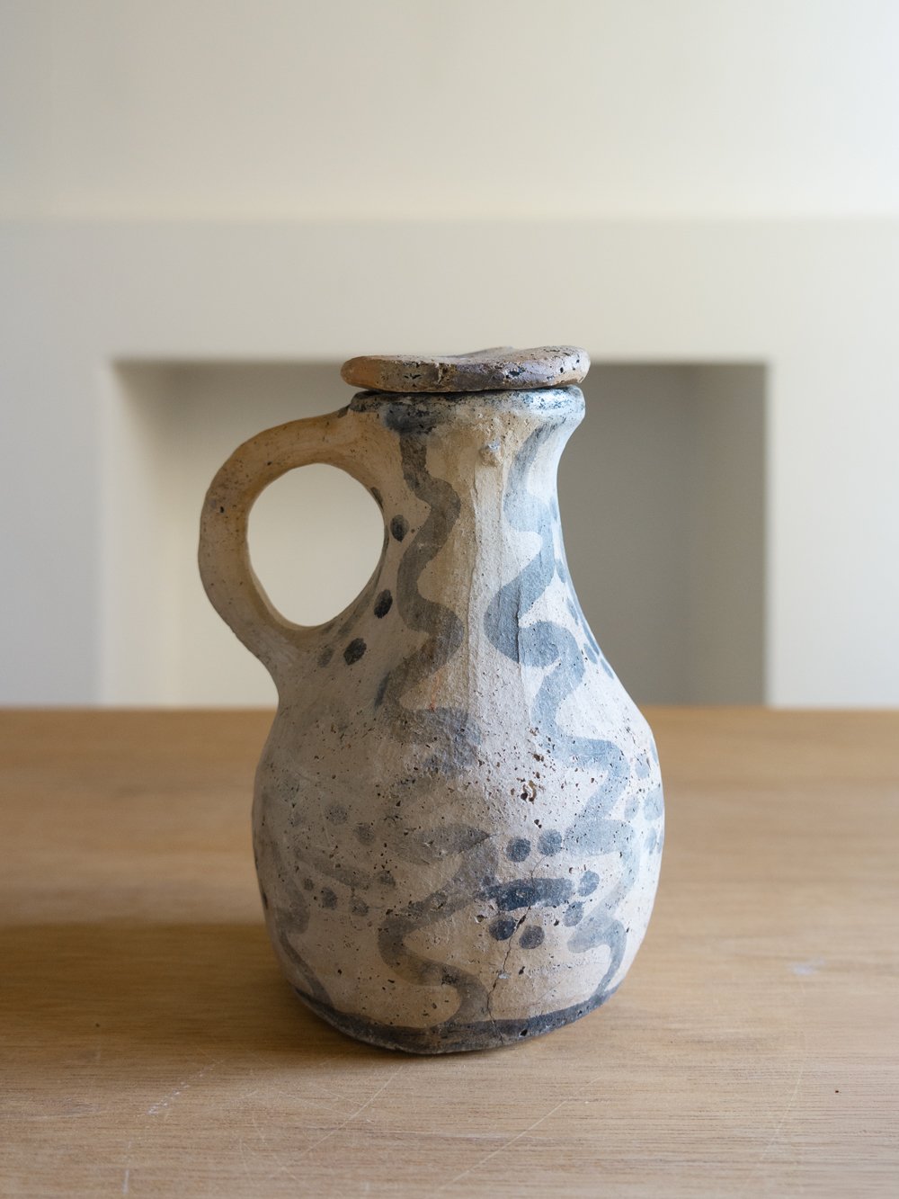 An unrefined ceramic pitcher with abstract black pattern.