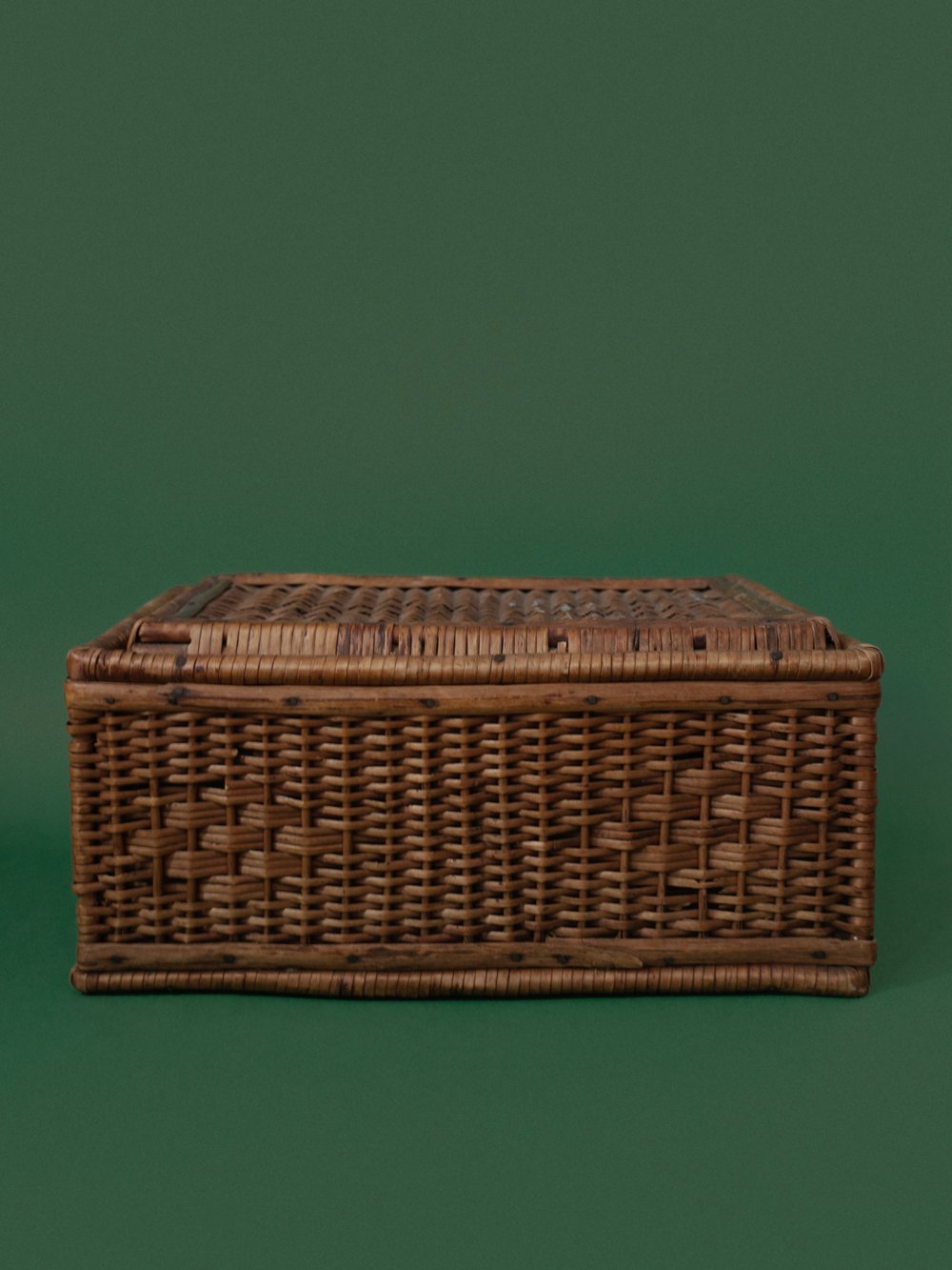 A beautiful vintage wicker basket with lid, lovely for storage or display.